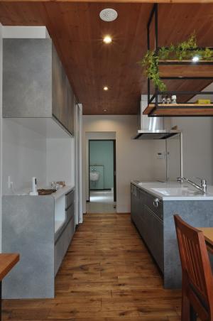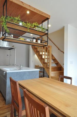 水廻りの家事動線に一番こだわりを持って設計しました。またリビング階段にすることで、家族が顔を合わせられるようにしたところもポイントです。リビングには、ご主人の嗜むウイスキーラック、奥様の為のマザーズデスク、子供のスタディデスクを設置し、リビングで家族を感じながら各々が作業をできるようにしました。